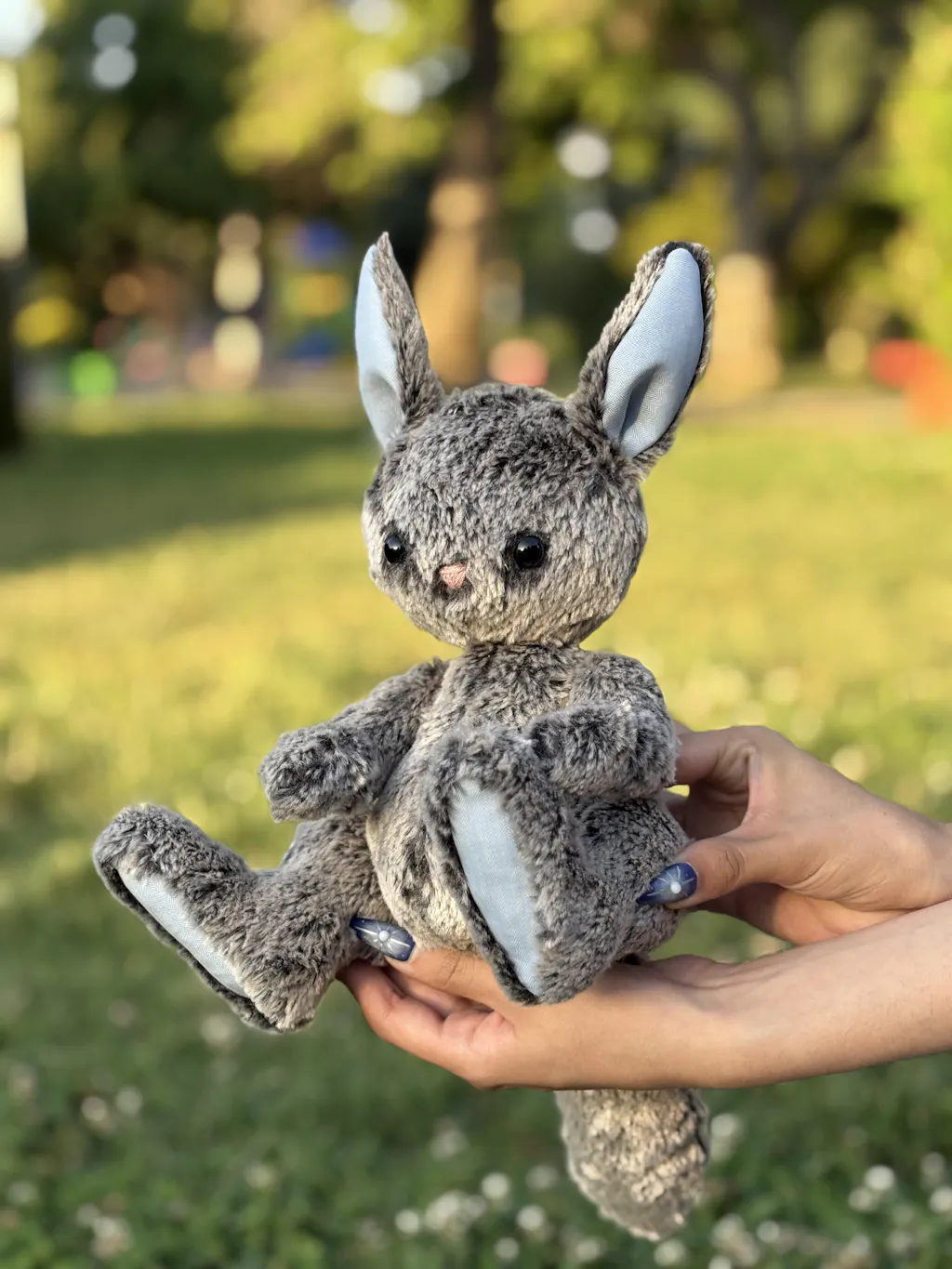 Finished bunny is 12" when standing and 11" when seated. Arms and legs move!
